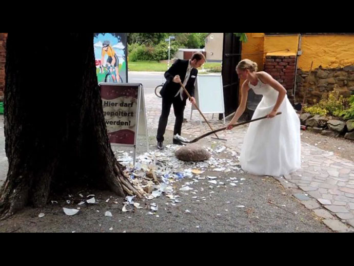 ภาพหมายเลข 2.ถึงคนเยอรมันจะขึ้นชื่อเรื่องความสะอาดและเป็นระเบียบ แต่ใครจะไปรู้ว่างานแต่งของชาวเยอรมันนี่แหละ ปั่นป่วนและวุ่นวายสุดๆ คนเยอรมันมีพิธีเขวี้ยงจานก่อนถึงวันแต่งงาน โดยเพื่อนๆของบ่าวสาวจะร่วมใจกันเขวี้ยงปาจานให้กระจายลงพื้น และคู่บ่าว-สาวจำเป็นต้องช่วยกันทำความสะอาด เพื่อสื่อให้เห็นถึงการอยู่ร่วมกันและช่วยเหลือกัน
