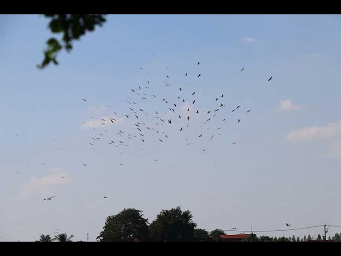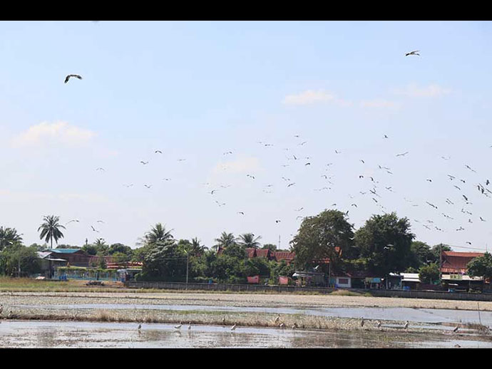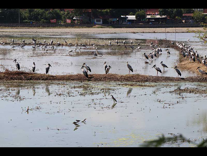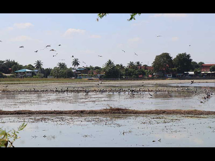 นายสมพิศ ยาโค อายุ 55 ปี เล่าให้ฟังว่า ในช่วงนี้น้ำในกลางทุ่งนาเริ่มลดลง ชาวนาในจังหวัดอ่างทอง ได้เร่งลงมือทำนาโดยการไถนาตีเทือกในแปลงนา และจะพบเห็นฝูงนกกระยาง ฝูงนกปากห่าง และนกนานาชนิดจำนวนมาก รวมตัวเป็นฝูงใหญ่ลงมาหากินหอย กินปลา และแมลงในแปลงนาข้าว โดยบินวนเวียนไปตามท้องทุ่งนาเป็นฝูงใหญ่ สำรวจไปตามท้องทุ่งนา ก่อนจะบินลงหาปลา หอย และแมลงกินในแปลงทุ่งนา เป็นการช่วยชาวนากำจัดศัตรูข้าว หอย แมลงชนิดต่างๆ ที่เป็นศัตรูตัวตามธรรมชาติของชาวนา