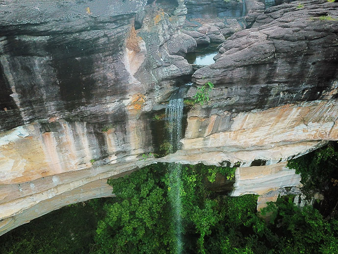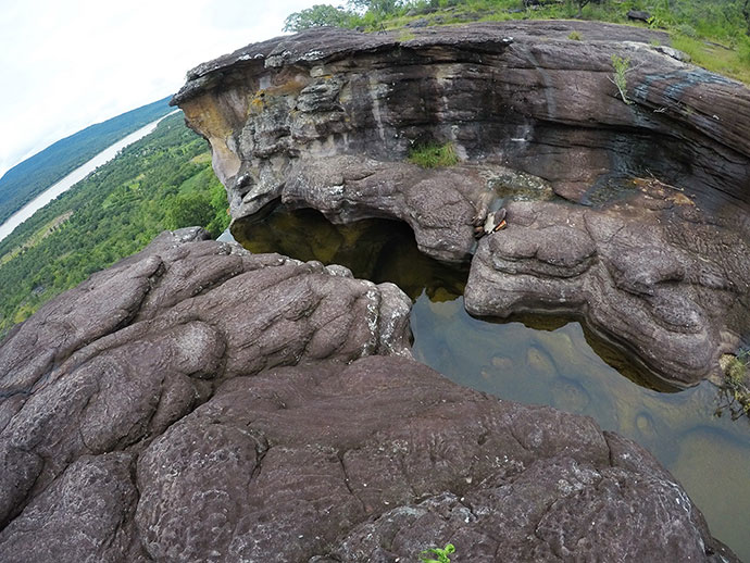 ในขณะเดียวกันสายน้ำก็รวมไหลจากที่สูงผ่านลานหินไหลรวมกันตกลงจากหน้าผาสู่แม่น้ำโขง ในระหว่างที่ไหลผ่านลานหิน หินทรายตรงไหนที่มีความทนทานด้วยธาตุต่าง ๆ ที่เสริมความแข็งแกร่งกว่าก็ไม่ถูกกัดเซาะคงทนสภาพ แต่ตรงไหนที่รวมตัวกันหลวมๆ ก็ถูกกัดเซาะได้ง่าย