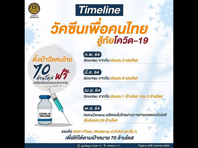 สำหรับประเทศไทยเมื่อวันที่ 5 มกราคม ที่ผ่านมา นายอนุทิน ชาญวีรกูล รองนายกรัฐมนตรีและ รมว.สาธารณสุข ให้ข้อมูลว่า ครม. มีมติจัดซื้อ-ฉีดวัคซีนโควิดสำหรับประชาชน จาก 3 บริษัทสามารถ ฉีดให้คนไทยได้ประมาณ 33 ล้านคน หรือคนไทยครึ่งประเทศ โดยมีดูไทม์ไลน์การทำงาน คือ เดือนกุมภาพันธ์ 200,000 โดส
