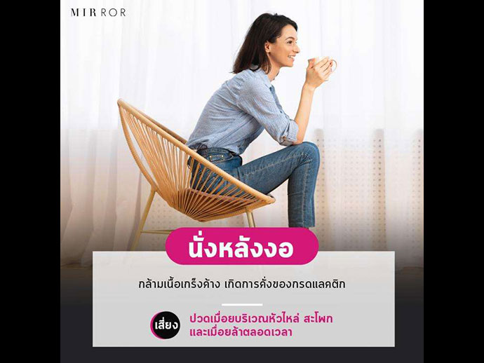 ท่านั่งแบบ การ "นั่งหลังงอ" จะทำให้กล้ามเนื้อเกร็งค้าง เกิดการคั่งของกรดแลกติก ปวดเมื่อยบริเวณหัวไหล่ สะโพก และเมื่อยล้าตลอดเวลา สุดท้ายจะทำให้กระดูกผิดรูปถาวร และกระดูกสันหลังงอได้