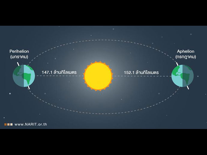 ในหนึ่งปี โลกโคจรรอบดวงอาทิตย์เป็นวงรี ทำให้มี 2 จุดบนวงโคจร คือจุดที่โลกจะอยู่ใกล้ดวงอาทิตย์ที่สุด เรียกว่า “เพอริฮีเลียน” (Perihelion) ในเดือนมกราคม และจุดที่ไกลดวงอาทิตย์ที่สุด เรียกว่า “อะฟีเลียน” (Aphelion) ในเดือนกรกฏาคม ซึ่งตรงกับวันนี้