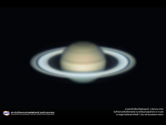 สถาบันวิจัยดาราศาสตร์แห่งชาติ (องค์การมหาชน) (สดร.) กระทรวงการอุดมศึกษา วิทยาศาสตร์ วิจัย และนวัตกรรม (อว.) เผยภาพ “ดาวเสาร์ใกล้โลกที่สุดในรอบปี” วันที่ 2 สิงหาคม 2564 บันทึกผ่านกล้องโทรทรรศน์ขนาดเส้นผ่านศูนย์กลาง 0.4 เมตร ในช่วงเช้ามืด เวลา 03.40 น. ณ หอดูดาวเฉลิมพระเกียรติ 7 รอบ พระชนมพรรษา สงขลา
