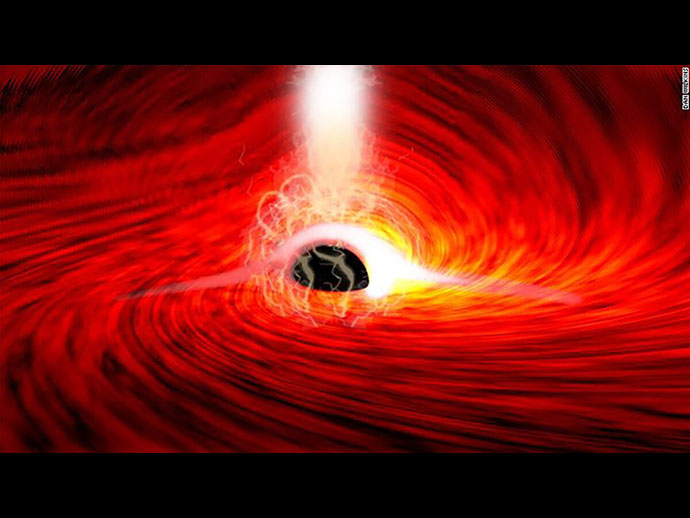 เมื่อก๊าซตกลงไปในหลุมดำ อุณหภูมิจะสามารถพุ่งสูงขึ้นได้ถึงหลายล้านองศา ทำให้อิเล็กตรอนแยกออกจากอะตอม ซึ่งสร้างพลาสมาแม่เหล็ก แรงโน้มถ่วงทรงพลังของหลุมดำทำให้สนามแม่เหล็กนี้โค้งสูงเหนือหลุมดำและหมุนวนจนสนามแม่เหล็กแตกกระจาย
