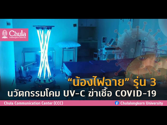 โดยเฉพาะเชื้อโควิด-19 โดยมี รศ.ดร.บุญรัตน์ โล่ห์วงศ์วัฒน ภาควิชาวิศวกรรมโลหะการ และ ดร.เจนยุกต์ โล่วัชรินทร์ ภาควิชาวิศวกรรมสิ่งแวดล้อม คณะวิศวกรรมศาสตร์ ร่วมกันพัฒนานวัตกรรม “น้องไฟฉาย” โดยใช้รังสี UV-C อยู่ในช่วงความยาวคลื่น 200-280 นาโนเมตร ซึ่งมีประสิทธิภาพสูงมากในการฆ่าเชื้อ ทั้งแบคทีเรีย ไวรัส และเชื้อรา โดยความเข้มข้นของแสง มีหน่วยวัดเป็นจูล/ตารางเซนติเมตร