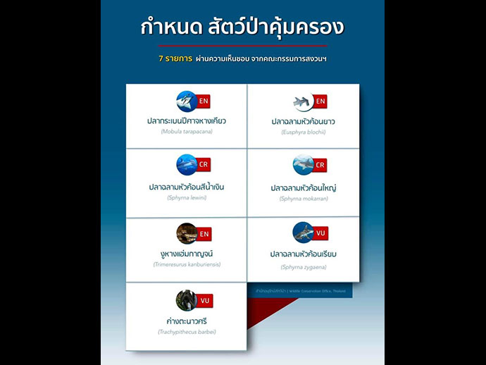 วันที่ 1 กันยายน เฟชบุ๊ก Thon Thamrongnawasawat ของ ผศ.ธรณ์ ธำรงนาวาสวัสดิ์ รองคณบดี คณะประมง มหาวิทยาลัยเกษตรศาสตร์ ได้โพสต์ข้อความ ระบุว่า ฉลามหัวค้อน และกระเบนปิศาจ กำลังจะได้รับการขึ้นทะเบียนเป็นสัตว์ป่าคุ้มครองเร็วๆนี้ หลังจากผู้เกี่ยวข้องหลายฝ่าย ร่วมกันผลักดัน โดย ผศ.ธรณ์ ระบุว่า