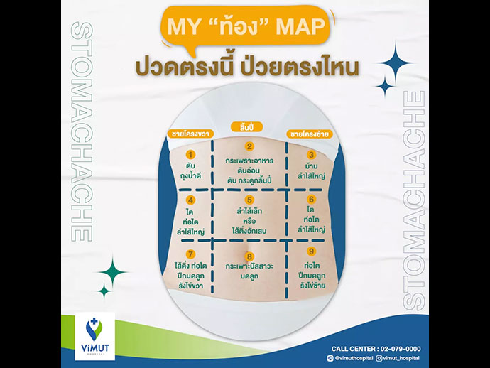 สำหรับอาการปวดท้องที่คนไข้สามารถสังเกตด้วยตนเองได้คือแบบที่ 2 หรือการปวดท้องตามตำแหน่งของอวัยวะ ซึ่งในทางการแพทย์จะแบ่งช่องท้องของคนไข้เป็น 9 โซน ได้แก่