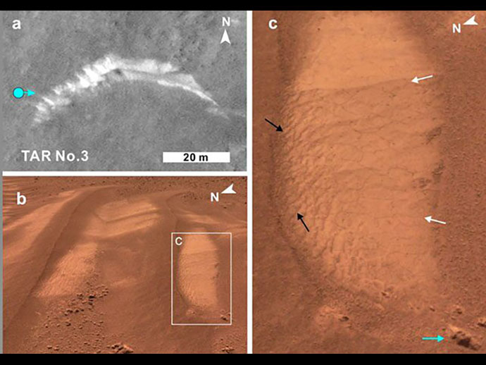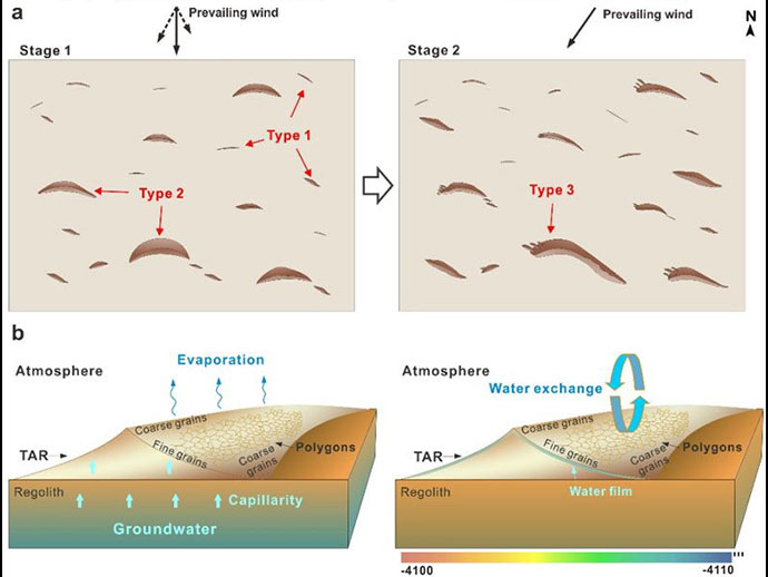 ศาสตราจารย์เซียวกล่าวว่าเมื่อพิจารณาภาพจากกล้องบนยานสำรวจดังกล่าว เราพบว่าโครงสร้างชั้นหินที่ปรากฏออกมานั้นแตกต่างจากหินภูเขาไฟทั่วไปบนพื้นผิวดาวอังคารอย่างมีนัยสำคัญ รวมถึงโครงสร้างชั้นหินอันก่อตัวจาก “เนินทรายทับถมจากลมพัด” (Aeolian sands)