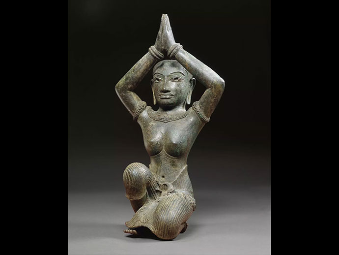 สตรีนั่งชันเข่าพนมมือ สันนิษฐานว่าเป็นสตรีชั้นสูงในราชสำนัก อายุราวพุทธศตวรรษที่ 16 หรือประมาณ 900-1,000 ปีมาแล้ว สูง 43 ซม. หล่อด้วยสำริด ประติมากรรมทั้งสองชิ้นนี้เป็นหลักฐานสำคัญที่แสดงว่า บริเวณภาคตะวันออกเฉียงเหนือของประเทศไทย เป็นแหล่งผลิตงานศิลปกรรมสำริดที่มีคุณภาพ
