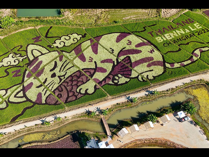 ผู้สื่อข่าวรายงานว่าในปัจจุบันที่ทุ่งนาพื้นที่หมู่บ้านขอนซุง หมู่ 4 ต.งิ้ว อ.เทิง จ.เชียงราย นายธันยพงศ์ ใจคำ ปัจจุบันทำงานเป็นผู้บริหารโรงงานผลิรถยนต์ที่ จ.พระนครศรีอยุธยา แต่ได้แบ่งเวลามาทำนาได้ปลูกข้าวหลากสีบนพื้นที่ประมาณ 5 ไร่ ซึ่งเมื่อมองจากที่สูงจะเห็นลวดลายของแปลงข้าวเป็นรูปแมวอย่างน้อย 2-3 ตัวอยู่ในกริยาต่างๆ ทั้งนอนหลับ ลืมตา ฯลฯ