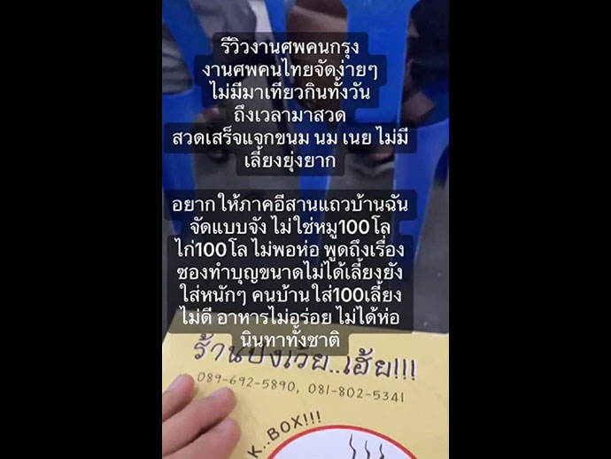 เจ้าของคลิประบุข้อความเอาไว้ว่า "รีวิวงานศพคนกรุง งานศพคนไทยัดง่ายๆ ไม่มีมาเทียวกินทั้งวัน ถึงเวลามาสวด สวดเสร็จแจกขนม ขม เนย ไม่มีเลี้ยงยุ่งยาก อยากให้ภาคอีสานแถวบ้านฉันจัดแบบจัง ไม่ชอบหมู 100 โล ไก่ 100 โล ไม่พอห่อ พูดถึงเรื่องซองทำบุญ ขนาดไม่ได้เลี้ยงยังใส่หนักๆ คนบ้านใส่ 100 เลี้ยงไม่ดี อาหารไม่อร่อย ไม่ได้ห่อ นินทาทั้งชาติ"
