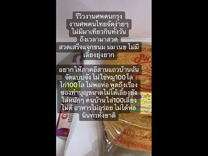 เกี่ยวกับเรื่องนี้ ผู้ใช้งาน Tiktok ชื่อว่า @uncharee_p17 ได้โพสต์คลิป รีวิวงานศพคนกรุง หลังจากที่ได้ไปร่วมงานสวดอภิธรรมที่วัดแห่งหนึ่ง โดยภายในงานจัดอย่างเรียบง่าย และระหว่างที่พระกำลังสวดเจ้าภาพได้จัดเซทของว่างให้กับแขกที่มาร่วมงาน จนทำให้เธอนั้นรู้สึกว่าอยากให้ที่อีสานแถวบ้านจัดงานอย่างเรียบง่ายเช่นนี้บ้าง