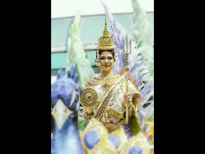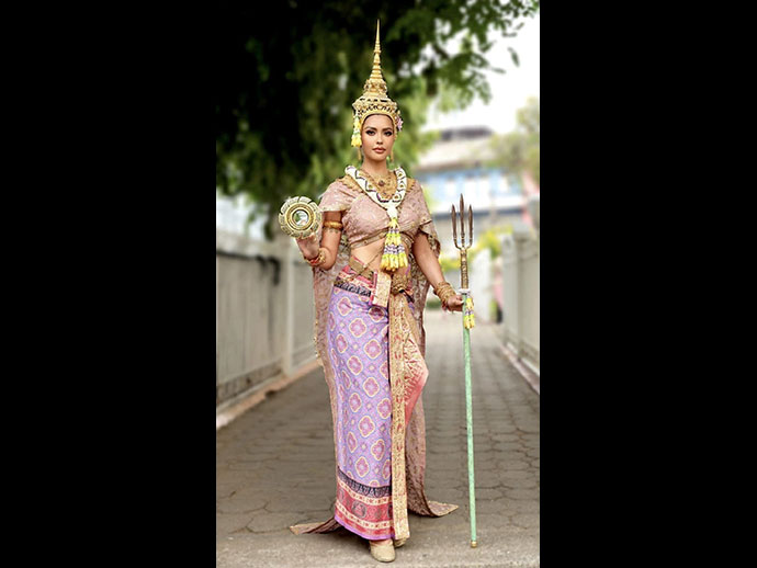แอนโทเนีย โพซิ้ว รองนางงามจักรวาล มิสยูนิเวิร์สไทยแลนด์ 2023 และรองชนะเลิศอันดับ 1 มิสยูนิเวิร์ส 2023 สุดตระการตา ในชุด นางสงกรานต์ “นาฏยานารี เทวีมโหธร” ซึ่งนำเอาเอกลักษณ์อันโดดเด่นของการแต่งกายซึ่งมีอยู่หลากหลาย หนึ่งในนั้นคือการห่มผ้าสองชาย นุ่งผ้าจีบด้วยผ้าลายอย่างลายสร้อยสามหาวแบบจิตรกรรมไทยชักชายสบัด สวมมงกุฏกษัตรีย์อย่างนางกษัตริย์ในนาฏกรรมไทย ทั้งยังสร้างสรรค์ศาสตราวุธขึ้นใหม่อย่างวิจิตรด้วยงานหัตถศิลป์ไทย ด้วยลายรดน้ำ อย่างโบราณ เพื่อเป็นอาวุธประจำนางสงกรานต์ในปีนี้ นั่นคือ จักร และตรีศูล