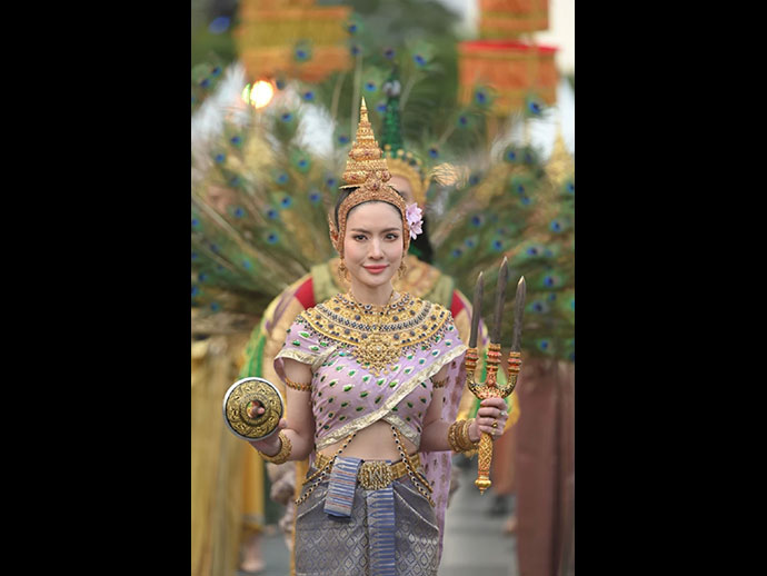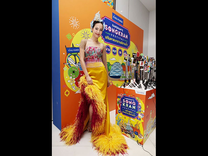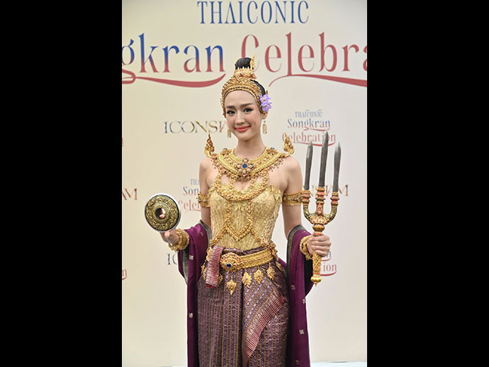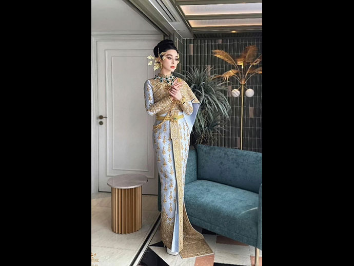 ฟ่าน ปิงปิง ซุปเปอร์สตาร์ชื่อดังแถวหน้าของจีน ที่แปลงร่างเป็น นางสงกรานต์ 2567 มาในชุดไทยศิวาลัยสีฟ้าอันวิจิตร ปักลวดลายดอกบัวหลวงด้วย คริสตัลสวารอฟสกี้สีทองคำ มูลค่าสูงเฉียดหนึ่งล้านบาท ผลงานการออกแบบสุดสร้างสรรค์ของ ดร.สรรค์ สุดเกตุ ดีไซเนอร์และเจ้าของแบรนด์ห้องเสื้อ วนัช กูตูร์ ด้วยรูปแบบชุดที่ชูความเป็นไทยได้อย่างเรียบหรูงดงามแล้ว ยังเป็นตัวแทนของความเป็นเอกลักษณ์ของไทยที่ไม่สามารถหาจากที่ใดได้อีก ในส่วนของเครื่องประดับที่ใช้คู่กัน ทำขึ้นโดยช่างฝีมือทองโบราณ