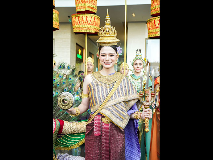 พาย รินรดา นางมโหธรเทวี นางสงกรานต์ ประจำวันเสาร์ ทัดดอกสามหาว (ผักตบชวา) มีนิลรัตน์เป็นเครื่องประดับ อาวุธคู่กาย พระหัตถ์ขวาถือจักร พระหัตถ์ซ้ายถือตรีศูล ประทับมยุราปักษา (นกยูง) เป็นพาหนะ แต่งกายภายใต้แนวคิดนางฟ้านางสวรรค์ตามจิตรกรรมไทยประเพณีตามลักษณะของนางสงกรานต์ ออกแบบโดย พีรมณฑ์ ชมธวัช เครื่องแต่งกายประกอบด้วยพัสตราภรณ์สีทอง นุ่งผ้าชักชายสะบัดอย่างโบราณ ด้วยผ้าไหมยกทองลายริ้ว นุ่งแบบกรวยเชิงหนึ่งชั้น เครื่องประดับจากอาภรณ์งามสตูดิโอ ประกอบด้วย กระบังหน้า เกี้ยวกลม กรองคอ (รูปแบบราชสำนักโบราณ) ต่างหู ธำมรงค์ กำไล รัดแขน (ทองคำแท้โบราณต้นรัตนโกสินทร์) ปั้นเหน่งและสายเข็มขัดทางมะพร้าว