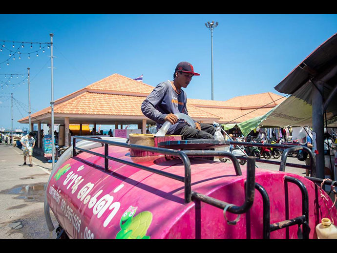 นายกาญจนพ สุขขี ชาวบ้านเกาะล้าน กล่าวว่า ช่วงนี้เข้าสู่หน้าแล้ง ทำให้เกาะล้านเข้าสู่สภาวะขาดแคลนน้ำ ซึ่งปกติน้ำประปาบนเกาะล้านที่ผลิตอยู่นั้นไม่เพียงพอต่อการใช้บริโภค ส่วนราคาน้ำขายในช่วงปกติอยู่ที่ 1 ตัน ราคา 150 บาท รถขนน้ำจะบรรจุได้รอบละ 2 ตัน คิดเป็นเงิน 300 บาท หากอยู่ในช่วงที่ต้องการน้ำมากราคาน้ำจะพุ่งขึ้นเป็นรอบละ 350-400 บาท แต่ถ้าช่วงแล้งจริงๆ ราคาน้ำเคยพุ่งสูงเป็นรอบละ 1,000-1,200 บาท