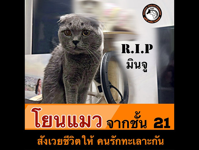 เมื่อวันที่ 14 พ.ค.2567 เพจเฟซบุ๊ก "มูลนิธิวอชด็อก ไทยแลนด์ Watchdog Thailand Foundation - WDT" ได้โพสต์ภาพพร้อมข้อความ ระบุว่า "ทอมใจเหี้ยมโยนแมวประชดแฟนจากชั้น21ตกลงมาตายอนาถ เป็นเรื่องราวสุดสลดของคนสองคนที่ทะเลาะกัน ทอมบี_คอสาว จนสาวผลักทอมออกไปนอกห้อง ไม่ทันคิดว่า มินจูแมวน้อยอยู่นอกห้องระเบียงด้วย มินจู จึงกลายเป็นเครื่องมือที่ต้องสังเวยด้วยชีวิต จากการขู่ว่าถ้าไม่เปิดประตูให้เข้าไปจะฆ่_ามินจู_แล้วก็จับมินจูโยนลงไปจากชั้น 21 ตอนนี้ สาวพามินจูไปวัด และจะกลับมาแจ้งความ และถ้าไม่เกิดอะไรขึ้น #WDTจะเป็นคนแจ้งความเองครับ ! "