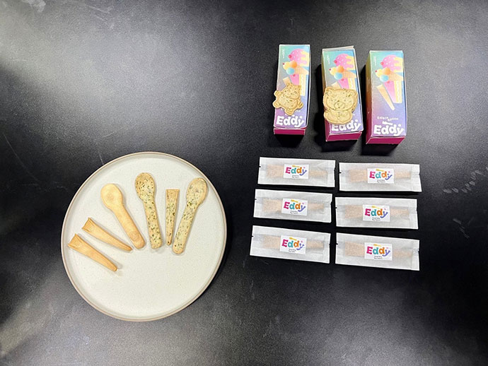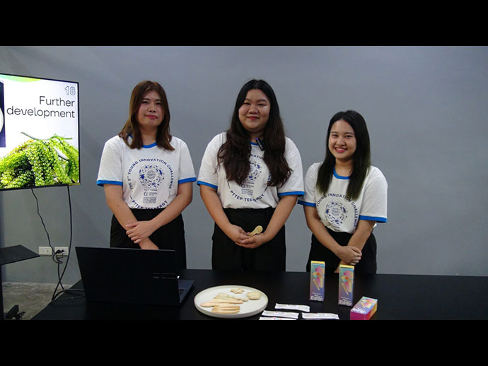 ปิดท้ายที่ผลงาน “ช้อนย่อยสลายได้ทางชีวภาพจากสารสกัดสาหร่าย” น.ส.วิสสุตา ฉัตรจิรโรจน์ หรือ น้องวิว นักศึกษาชั้นปีที่ 4 มหาวิทยาลัยมหิดล ตัวแทนทีมแก๊งลูกหมู กล่าวว่า ทีมคิดค้นช้อนโดยใช้สารสกัดจากสาหร่ายซึ่งย่อยสลายได้รวดเร็ว นำมาผสมกับแป้งข้าวหอมมะลิไทยและแป้งสาลีเพื่อขึ้นรูปผลิตภัณฑ์ หลังจากได้รับรางวัลจึงพัฒนา แม่พิมพ์ขึ้นใหม่ ให้มีรูปแบบที่หลากหลายขึ้น ใช้รับประทานได้ทั้งอาหารคาวและหวาน ทนความร้อนได้ดียิ่งขึ้น นอกจากนี้ยังพัฒนาสูตรและกระบวนการผลิตโดยใช้สาหร่ายพวงองุ่นอบแห้ง จากวิสาหกิจชุมชนอาหารทะเลแปรรูปบ้านพะเนิน จ.เพชรบุรี ช่วยลดขยะอาหาร เพิ่มมูลค่าผลิตภัณฑ์ และสร้างรายได้ให้ชุมชน...