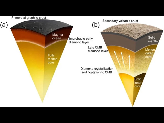 "กระบวนการนี้ก็เกิดขึ้นที่ระดับลึกลงไปใต้ดินด้วยเช่นกัน แต่ด้วยแรงดันที่รอยต่อระหว่างชั้นเนื้อดาวกับแก่นดาวของดาวพุธ ประกอบกับวัตถุดิบของดาวพุธที่มีคาร์บอนอยู่มาก เราเชื่อว่าคาร์บอนที่บริเวณรอยต่อนั้นไม่น่าจะอยู่ในรูปแกรไฟต์ แต่มันแพงกว่านั้น มันอยู่ในรูปเพชร" รศ.โอลิเวียร์ นามูร์ จากมหาวิทยาลัยแคทอลิกลูเวิน หัวหน้านักวิทยาศาตร์ที่วิจัยเรื่องนี้อธิบาย