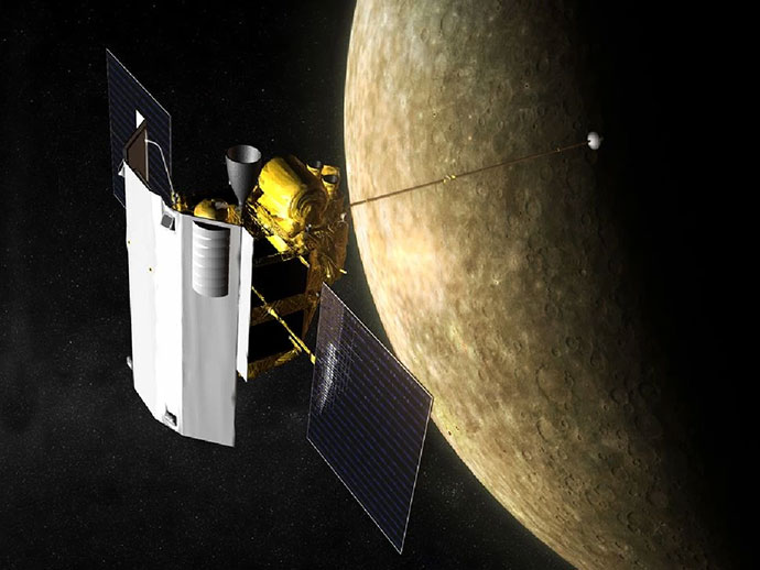 ยานเมสเซนเจอร์ขณะสำรวจดาวพุธ (ภาพตามจินตนาการของศิลปิน) ยานแมสเซนเจอร์ไปถึงดาวพุธในเดือนมีนาคม 2554 (จาก NASA/Johns Hopkins University Applied Physics Laboratory/Carnegie Institution of Washington)