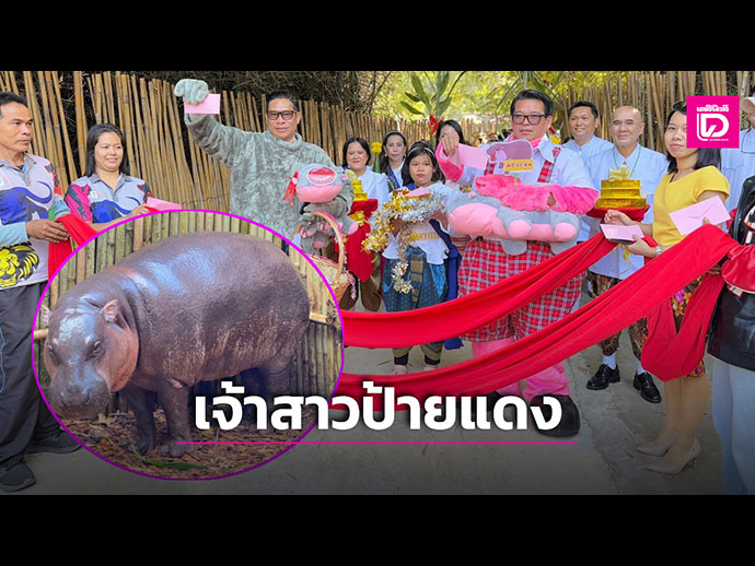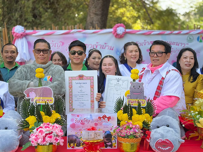 เมื่อวันที่ 23 ธ.ค. ที่สวนสัตว์นครราชสีมา จัดพิธีสู่ขอ “หมูมะนาว” ฮิปโปแคะสาวเป็นสะใภ้ “หมูตุ๋น” พี่ชายหมูเด้ง ที่สวนสัตว์เปิดเขาเขียว จ.ชลบุรี โดย นายณรงวิทย์ ชดช้อย ผู้อำนวยการสวนสัตว์เปิดเขาเขียว และนายธนชน เคนสิงห์ ผู้อำนวยการสวนสัตว์นครราชสีมา นำขบวนขันหมากสินสอดอย่างสวยงาม เพิ่มสีสันด้วยการจัดโฉนดที่ดินสวนสัตว์ เงินทองสินสอด (เงินทองจำลอง) แบบทุ่มสุดตัว บรรยากาศเต็มไปด้วยความชื่นมื่น พร้อมด้วยเจ้าหน้าที่ผู้ดูแลสวนสัตว์เข้าร่วมพิธี พร้อมทั้งมีเยาวชนนักเรียนเข้าชมอย่าคึกคัก