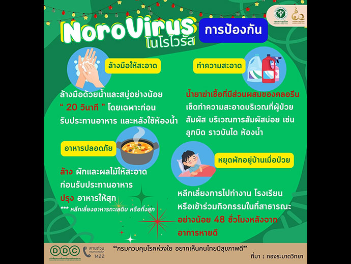 กรมควบคุมโรค กระทรวงสาธารณสุข บอกเล่าความรู้เกี่ยวสาเหตุและวิธีป้องกันเชื้อร้ายนี้ ว่า “โนโรไวรัส” เป็นไวรัสที่ติดต่อได้ง่าย มีความทนทานต่อความร้อนและน้ำยาฆ่าเชื้อต่างๆได้ดี ขณะเดียวกัน เชื้อดังกล่าวมักถูกตรวจพบมากขึ้นในช่วงฤดูหนาว เนื่องจากสภาวะอากาศที่เย็น ทำให้เชื้อเจริญเติบโตได้ดี ส่งผลให้อาหารและน้ำดื่มมีโอกาสปนเปื้อน จึงมีโอกาสพบผู้ป่วยโรคอุจจาระร่วงเฉียบพลันจากเชื้อไวรัสชนิดนี้เพิ่มขึ้นในฤดูหนาว